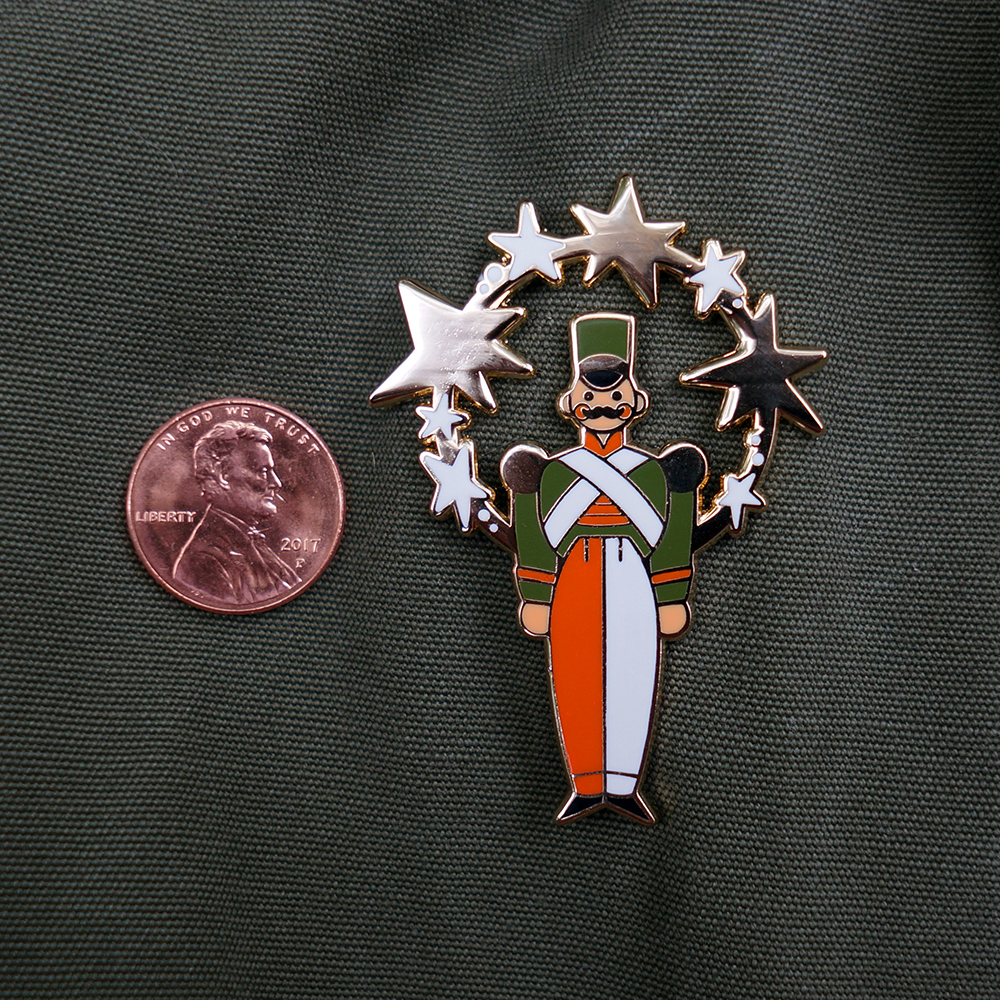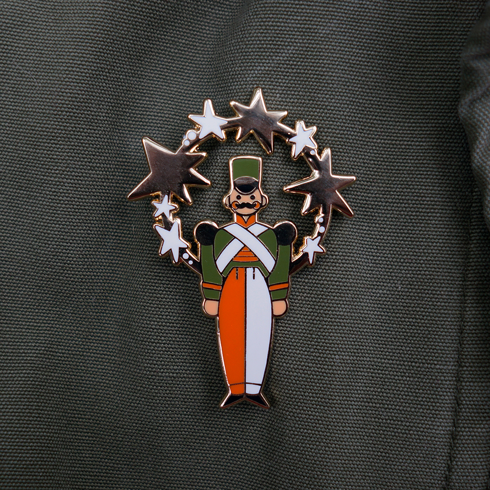 This 55mm gold-plated hard enamel pin has two rubber backings and features a toy soldier and a ring of stars.