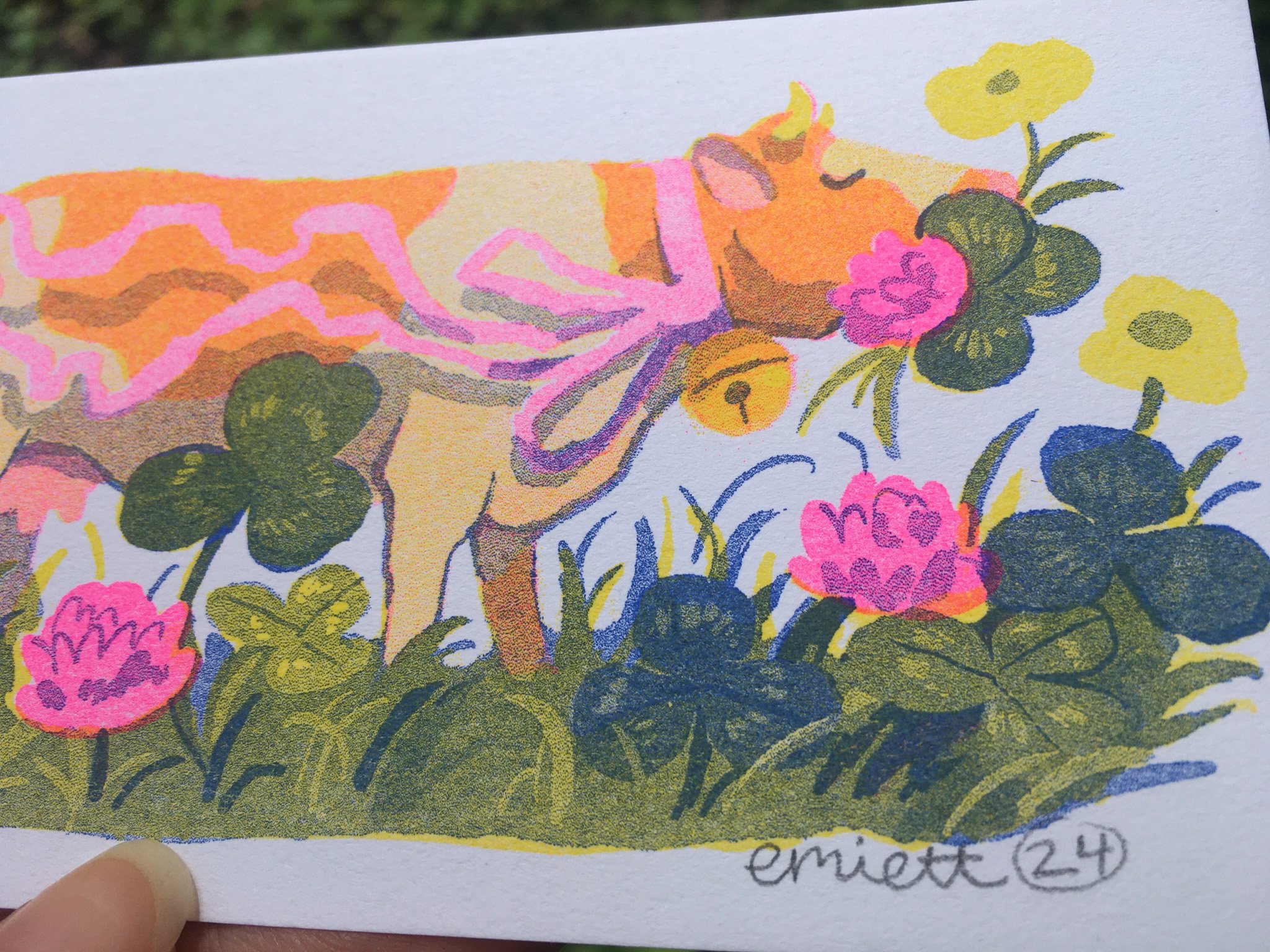 This little 3x6" cow print is printed with fluo pink, yellow and blue riso ink.