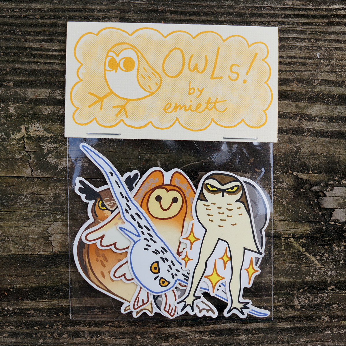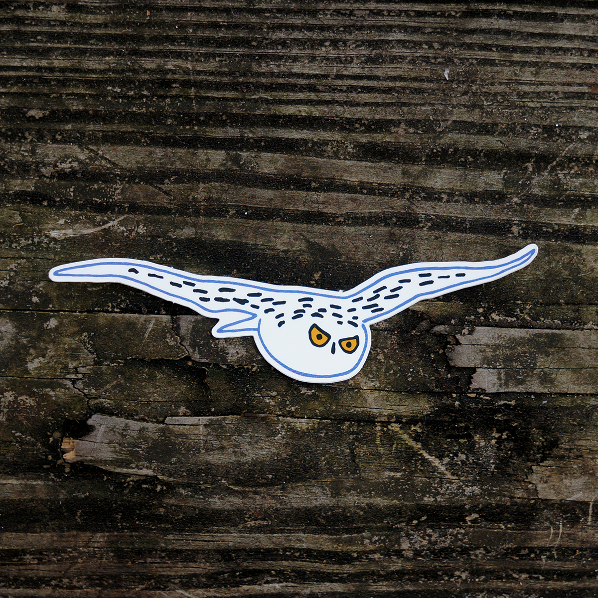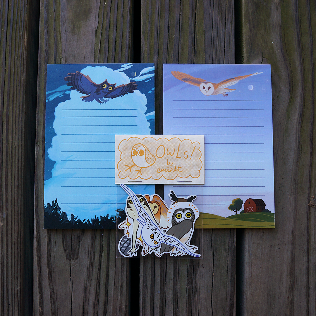 The set includes 2 50-page owl note pads (barn owl and screech owl) and 6 matte vinyl owl stickers (barn owl, burrowing owl, great gray owl, snowy owl, saw-whet owl, and great horned owl)!