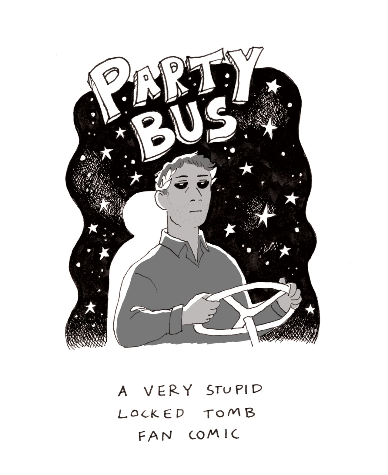 A very silly grayscale folded zine wherein John Gaius, the Emperor Undying, Necrolord Prime, regrets renting a party bus.